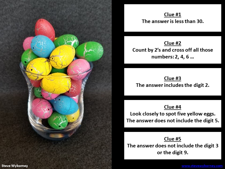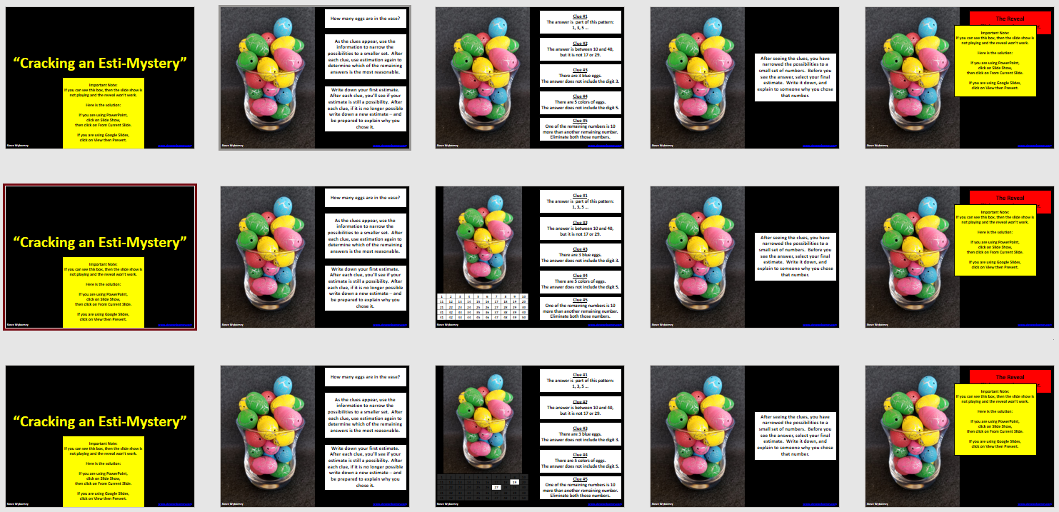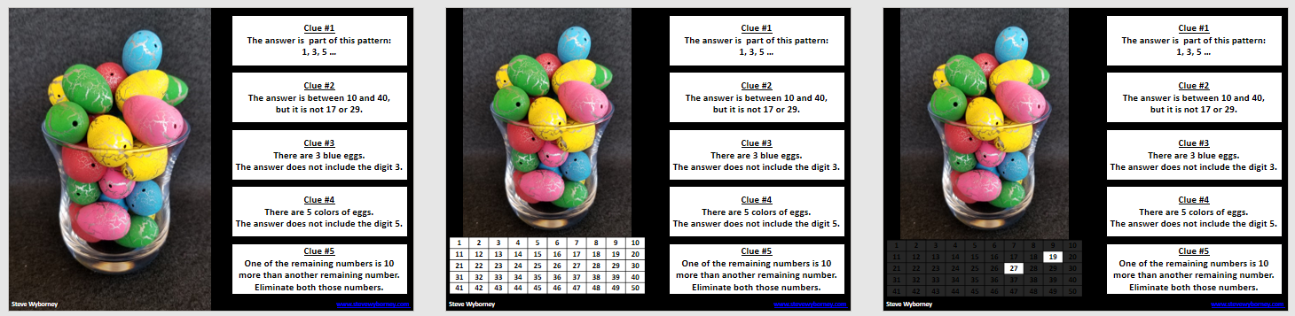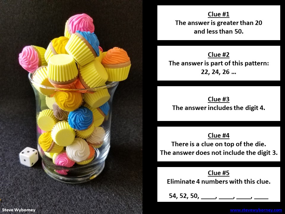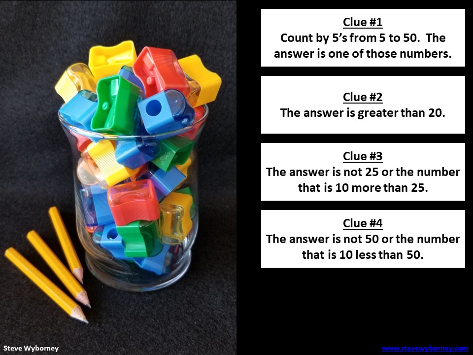 The chart is animated in this version.  After each clue appears, students read the clue, discuss the ideas, possibly adapt their estimate...