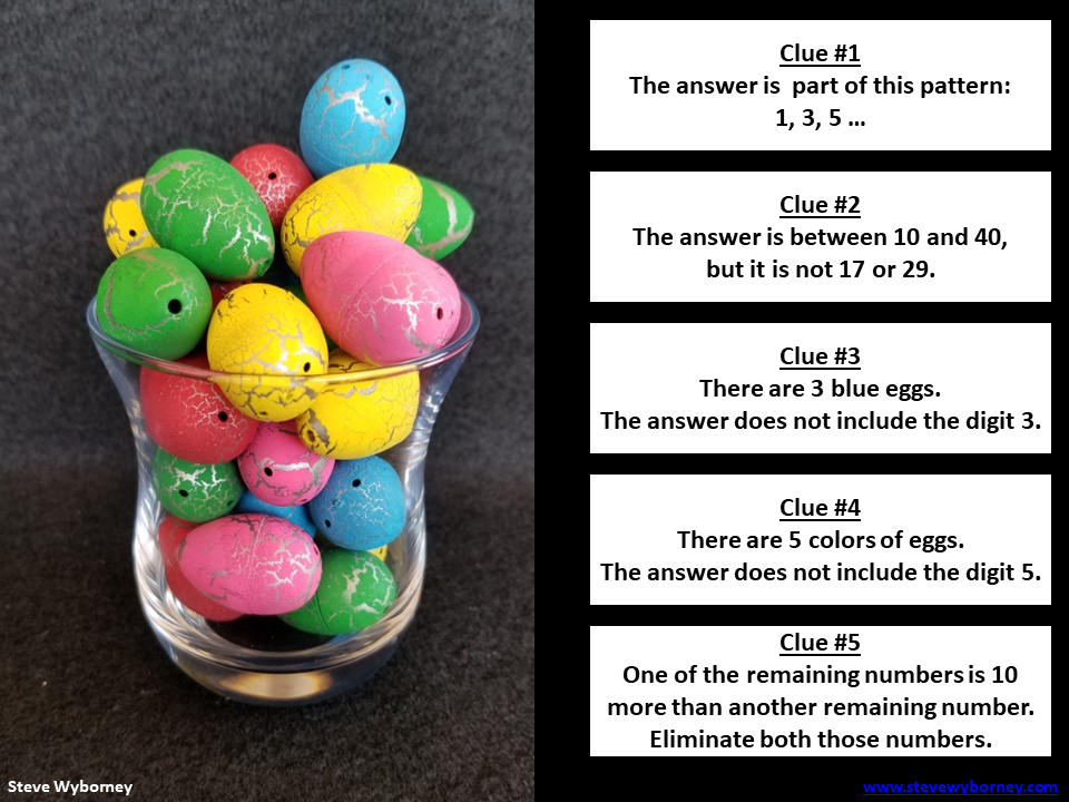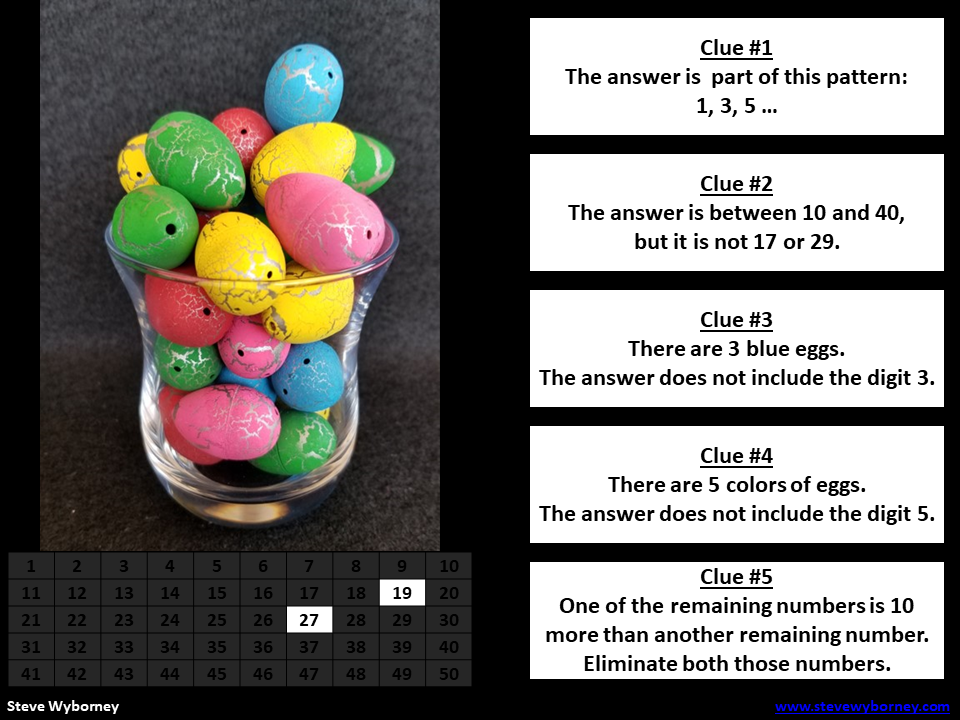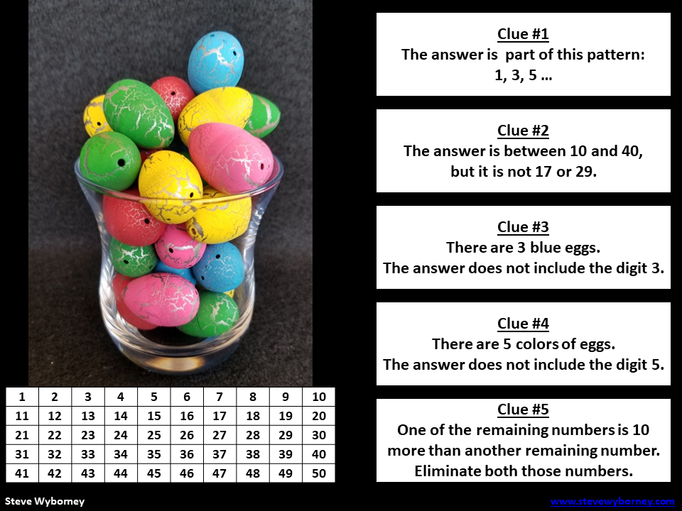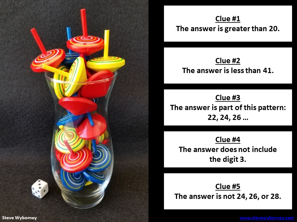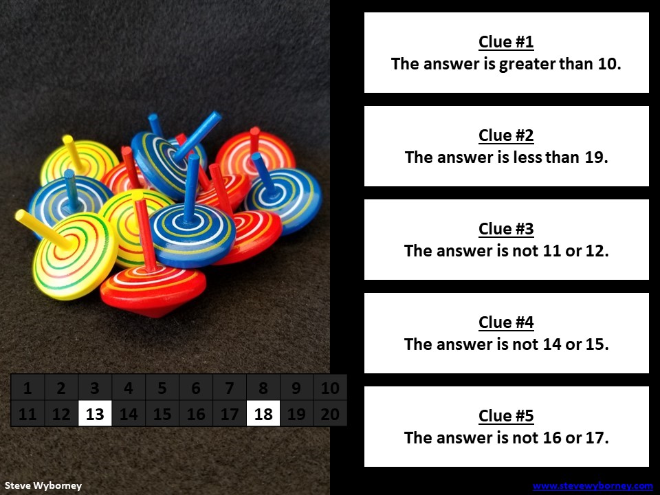 The chart is animated in this version.  After each clue appears, students read the clue, discuss the ideas, possibly adapt their estimate...
