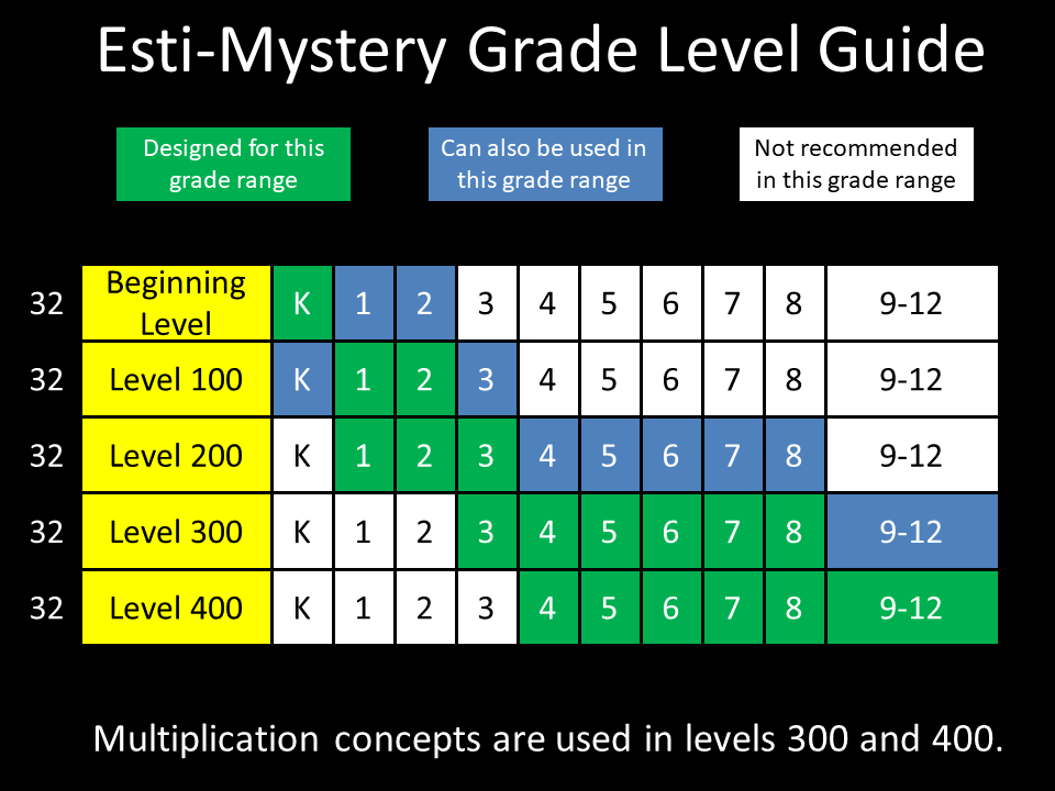 For example, 3rd grade can use Esti-Mysteries at levels 100, 200, and 300!