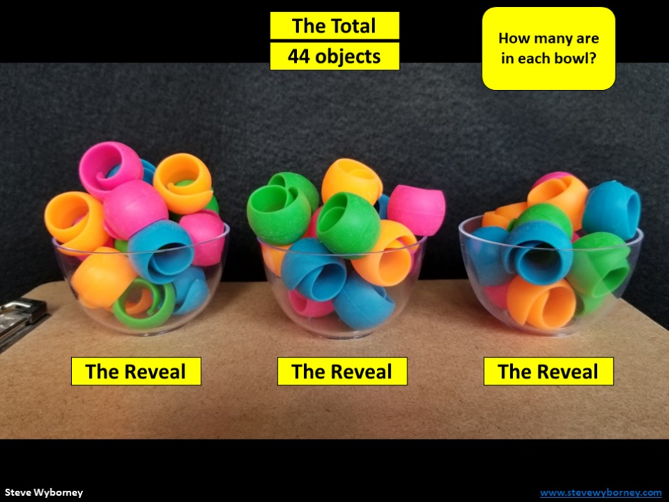 This newer routine includes 16 sets.  Students are given the total and are asked to estimate the number in each container.