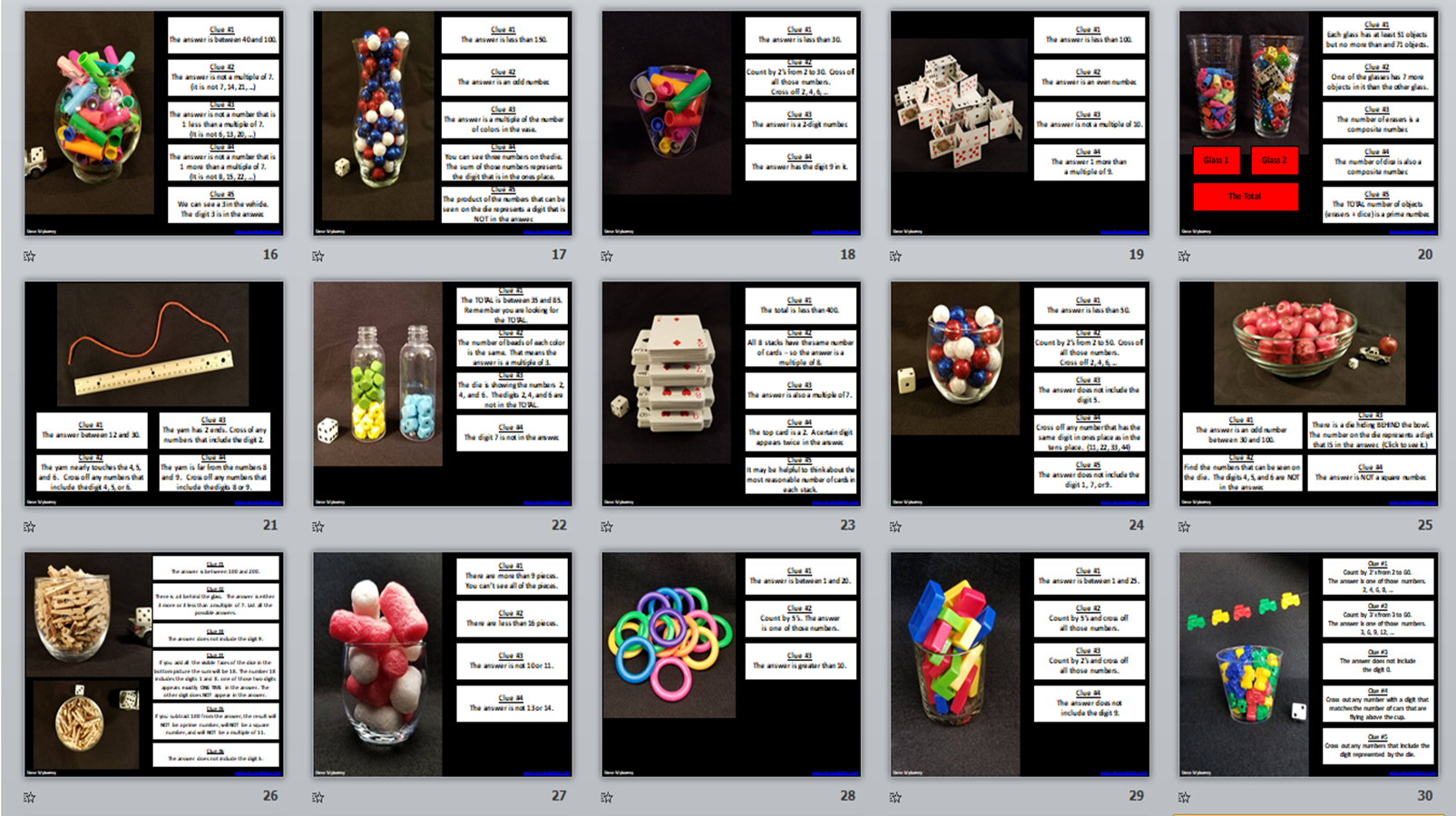 These images show just the clue slide from each of the 77 Esti-Mysteries.